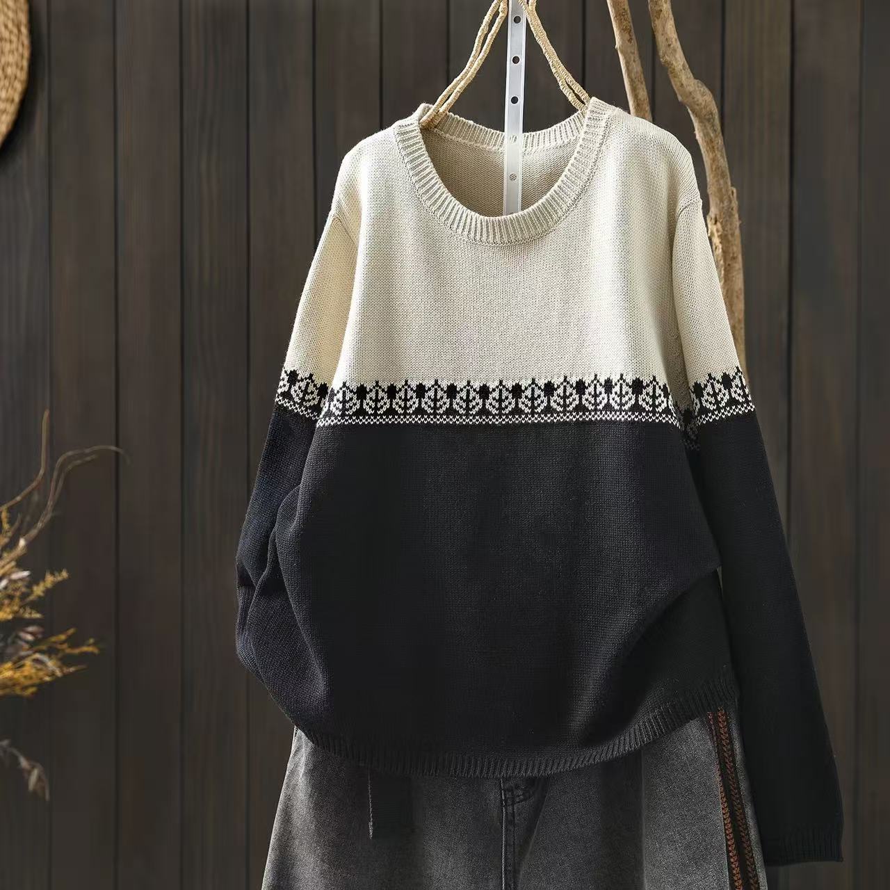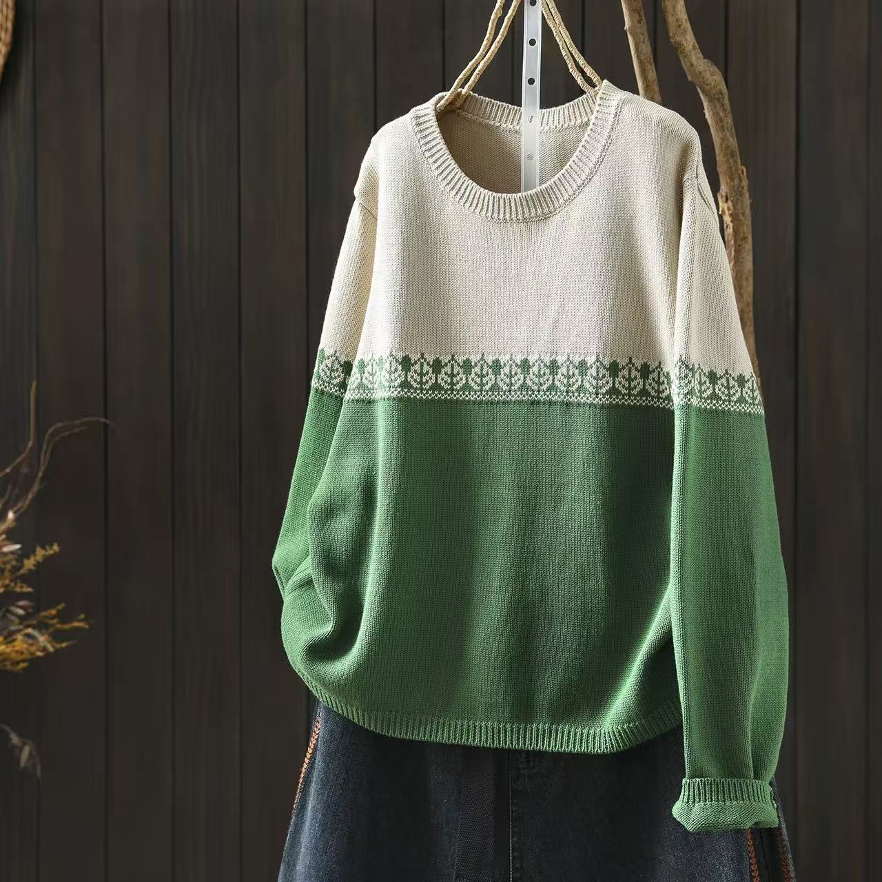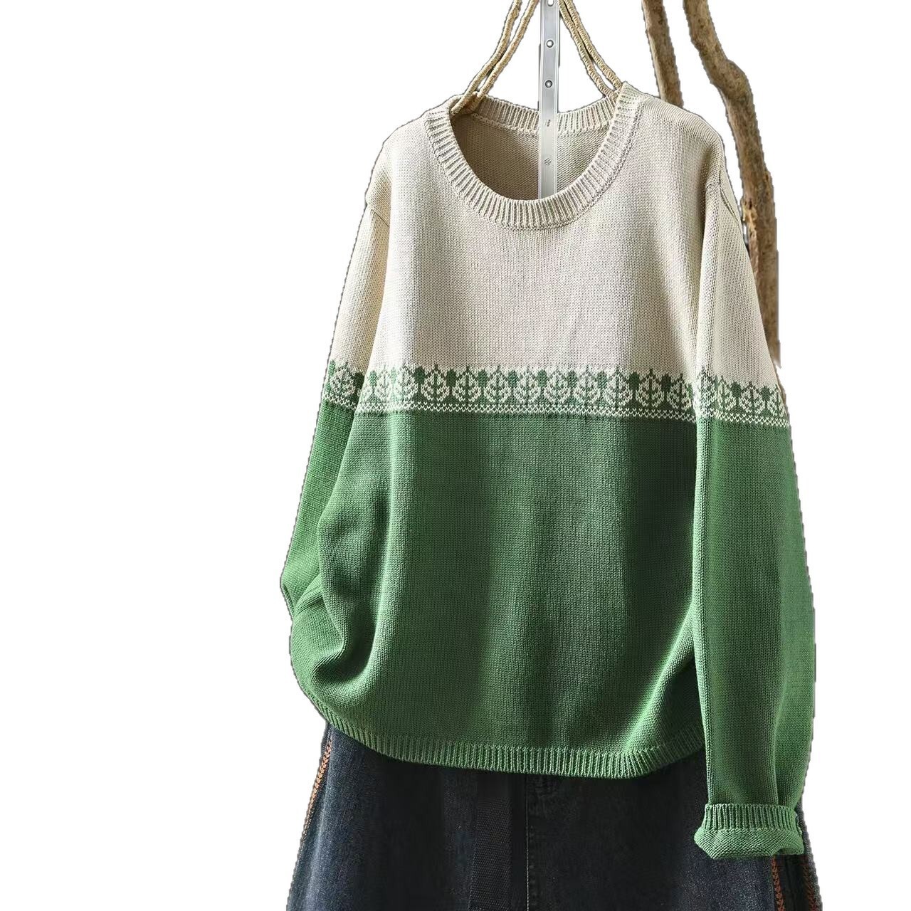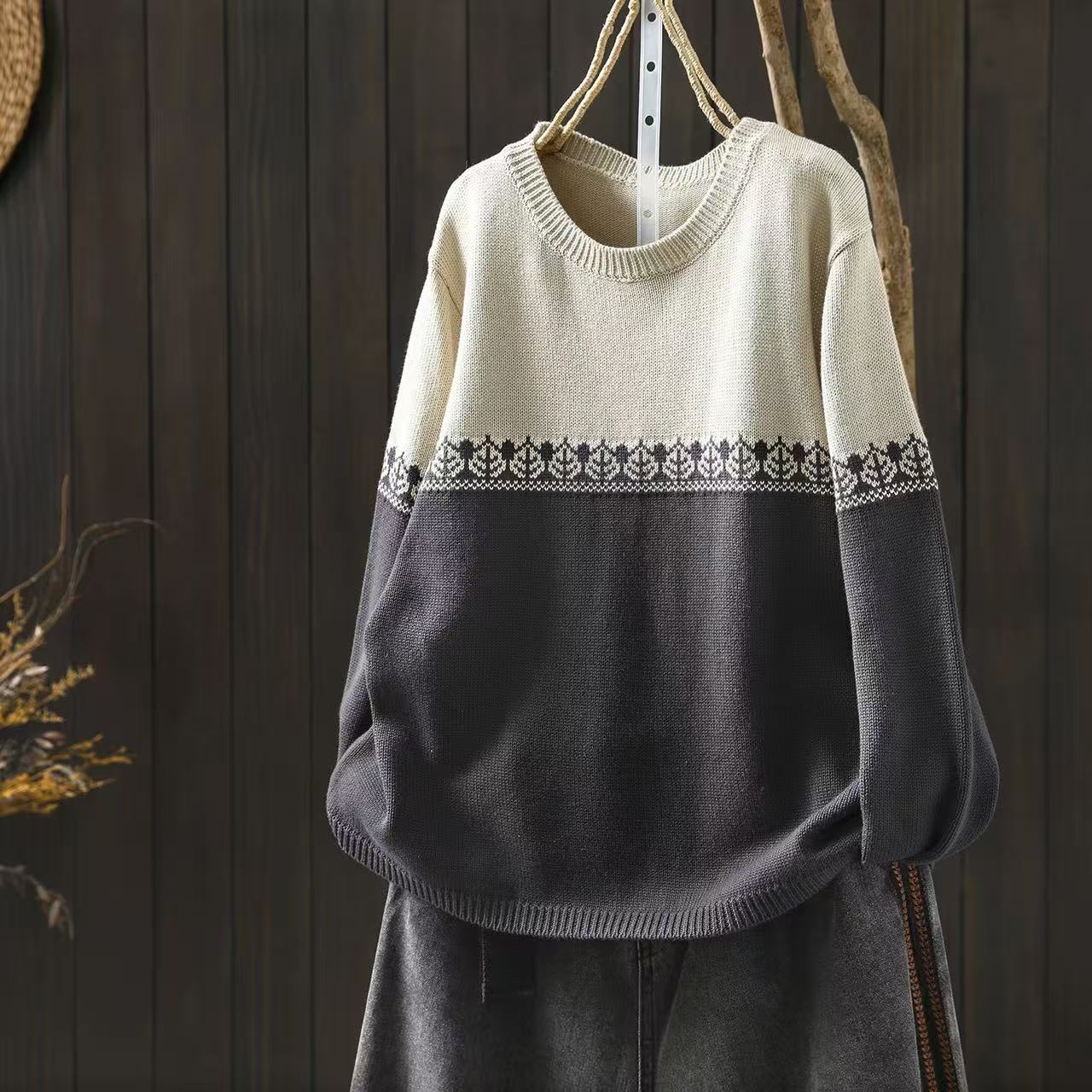Crew-neck Preppy-style Cotton Knit Sweater Loose And Casual